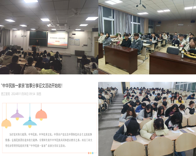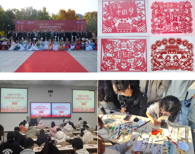 经济管理学院、文学院承办“石榴花开,培根育魂”西安工业大学第三届民族文化节;光电学院、材料与化工学院举办“民族手工牵丝情,仙宫众志绘同心”活动,学生们在亲手创作的过程中,感受民族文化的独特魅力;电子信息工程学院、经济管理学院、设计学院、中国书法学院以及新生院联合组织学生参与民族文化主题展览、民族文化知识竞答、民族团结教育报告会等活动,学生们在其中领略民族文化的绚丽多彩,聆听民族团结的深刻内涵;建筑工程学院积极参与录制“石榴花开、培根育魂”西安工业大学第三届民族文化节微视频,各民族学生共同展示特色文化、交流互动,促进了彼此之间的心灵相通和情感共鸣,活动吸引了超过500位同学踊跃参与,形成了各民族学生携手共促团结进步的良好局面。