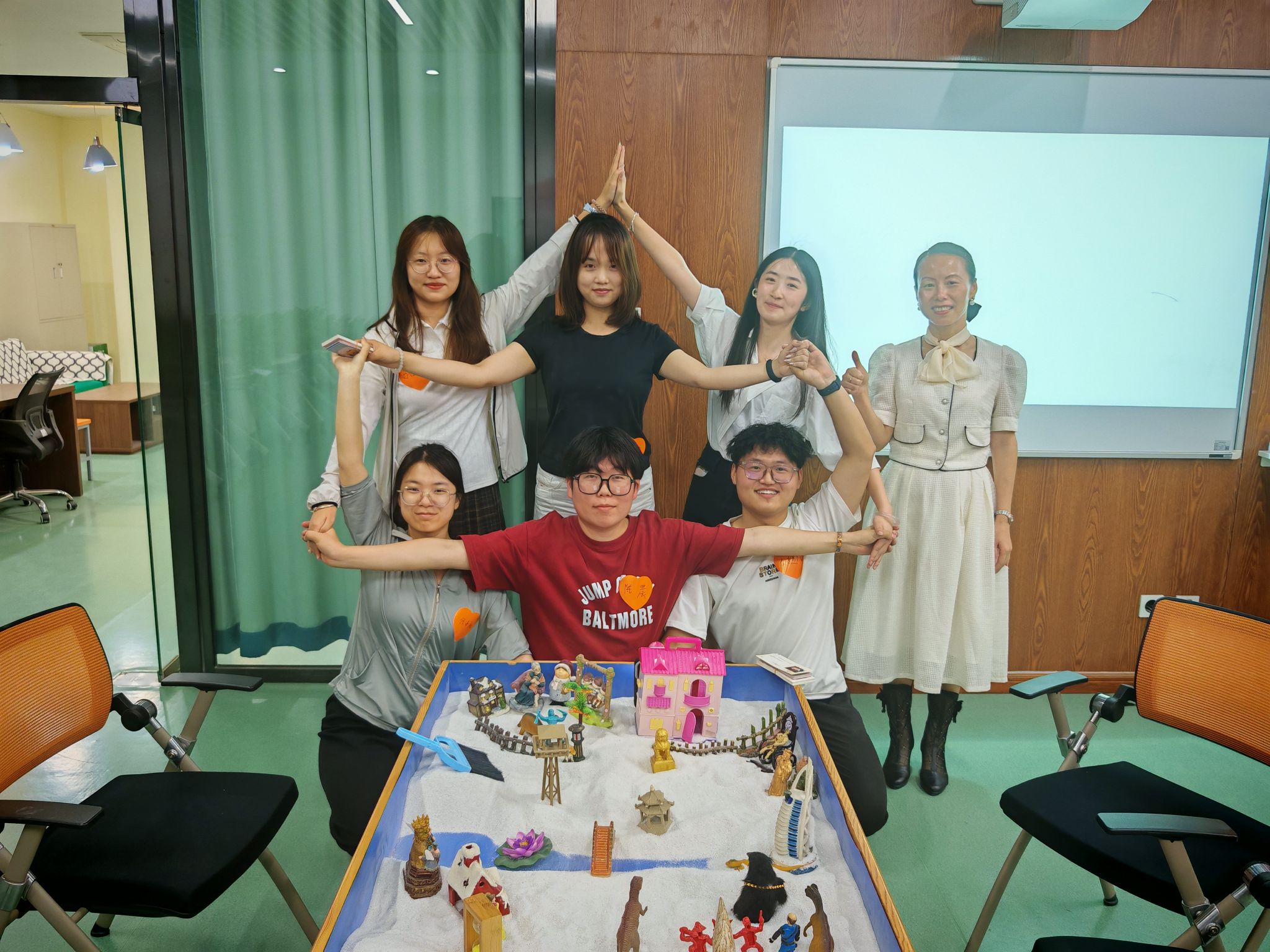工作坊以“名字接龙织心网”破冰开场。心理委员们通过“姓名+爱好”的接龙互动,在欢笑中编织“人际心网”,如“喜欢心理学的陈晨”与“热爱摄影的梁圆圆”的联结,让成员在倾听中感受温暖。主体活动“沙盘探秘悟初心”与“信任之旅践使命”引发深度共鸣。在团体沙盘创作中,心理委员以沙具为媒,诠释助人初心:桥梁象征师生纽带,烛火隐喻倾听价值,破茧成蝶展现成长蜕变。通过实践,大家领悟到“助人非替代,而是成为引路星光”。总结环节,心理委员抽取“萨提亚与正念”书签盲盒,在“倾听是心灵的拐杖”等箴言中汲取力量。代表王健分享:“沙盘中的‘桥梁’让我重拾初心,‘信任之旅’教会我有效支持;《以生命影响生命》的书签将时刻提醒我——助人者,亦是修心人。”