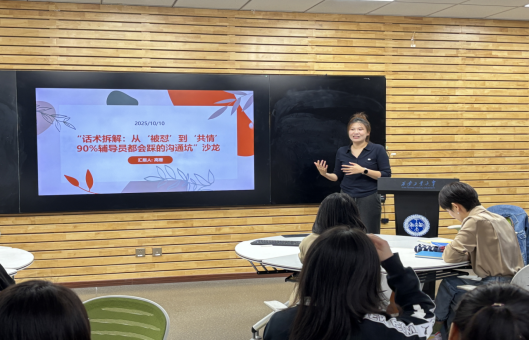 10月10日下午,我校本学期第一期辅导员沙龙在教4-307教室举行。本次沙龙由机电学院学工办主任高珊担任主讲,以“话术拆解:从‘被怼’到‘共情’——90%辅导员都会踩的沟通坑”为主题,各学院专职辅导员及学工部相关负责人参加此次活动。