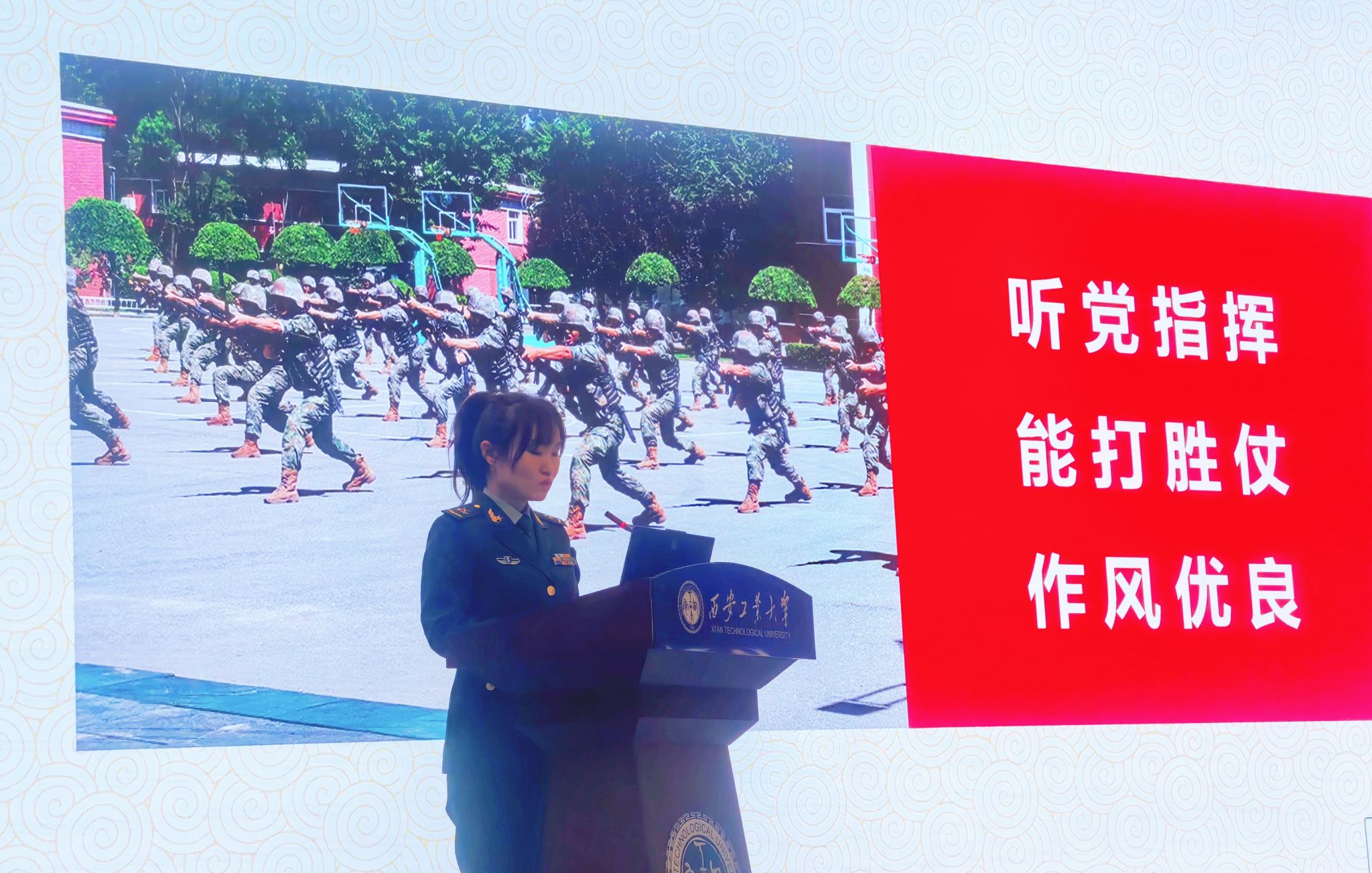 接着,设计学院2022级学生、从军八年的陈圆分享了自己的军旅生活,从新兵连的艰苦训练到话务员岗位的严苛要求,从文书工作的日夜坚守到收获荣誉与战友情,陈圆用亲身经历展现了军营对青年的磨砺与塑造,引发了在场学生的强烈共鸣,进一步点燃了大家参军报国的热情。