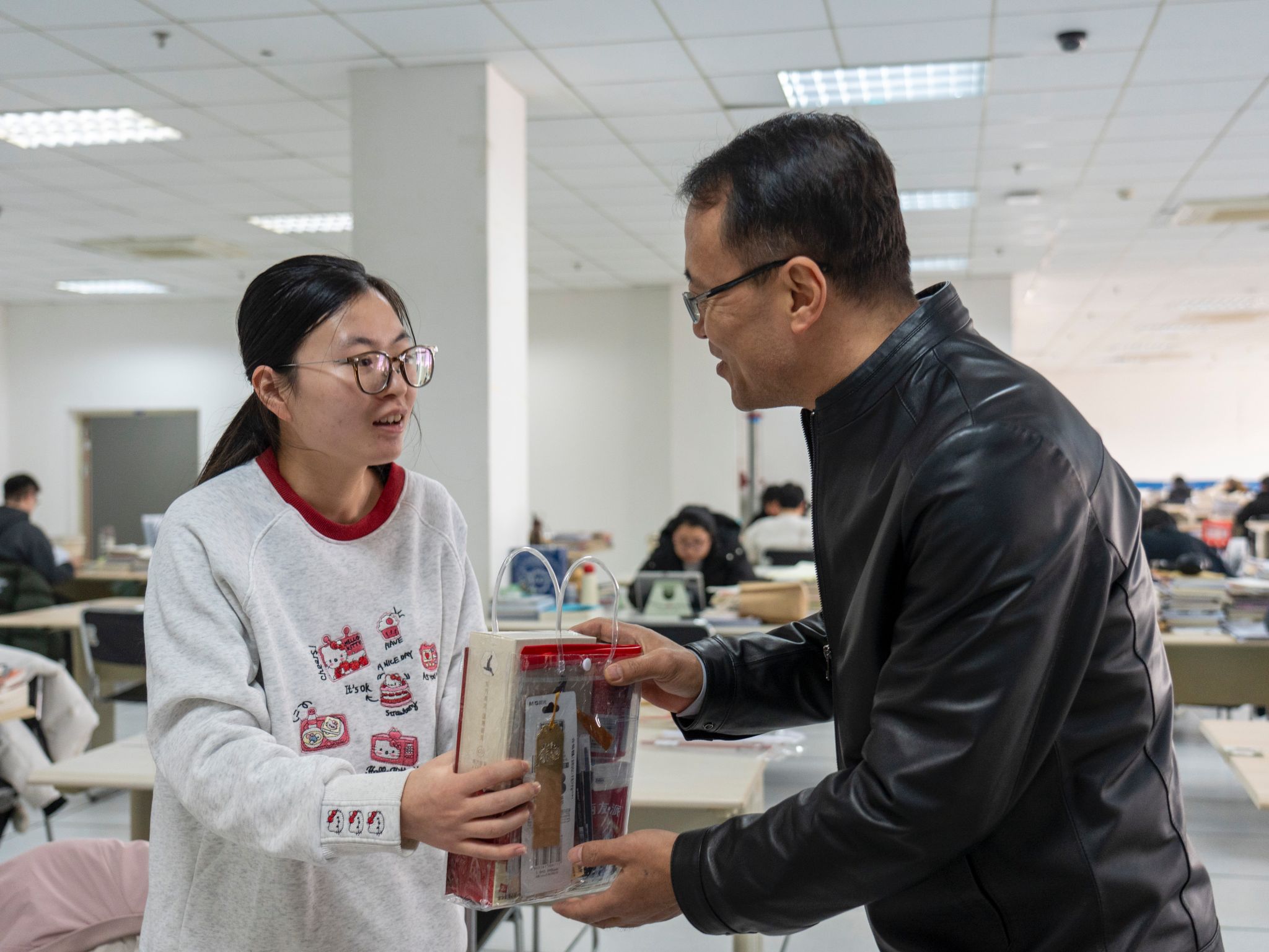 文具礼盒、蒸汽眼罩、心愿便利贴……12月16日,正值考研冲刺节点,校党委副书记马福前往图书馆考研自习室慰问学生,为考研学子送上加油包,为他们加油鼓劲。