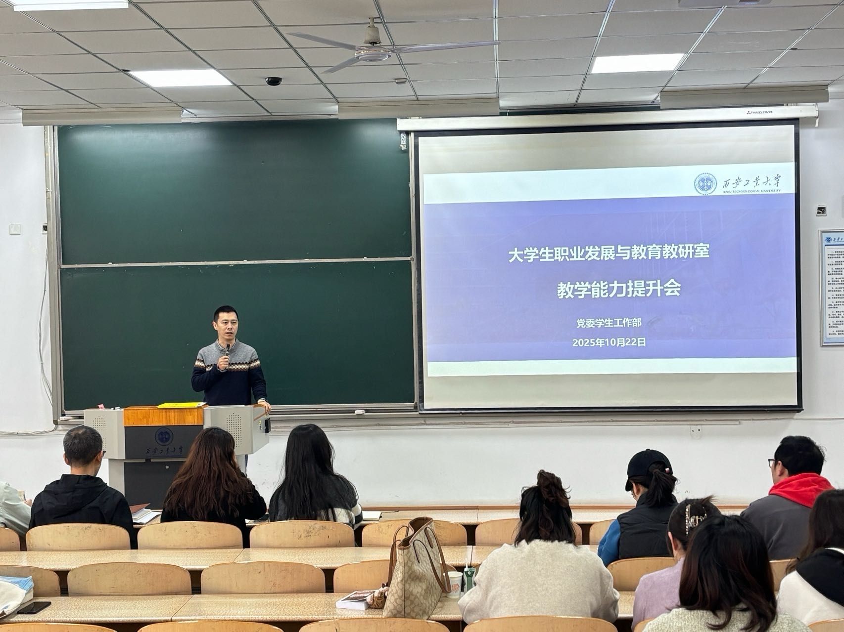为进一步提升教学质量,促进教学水平整体跃升,10月22日上午,《大学生职业生涯规划与就业指导》课程教学能力提升会在教1-204召开。课程全体任课教师参会,会议由教研室负责人主持。