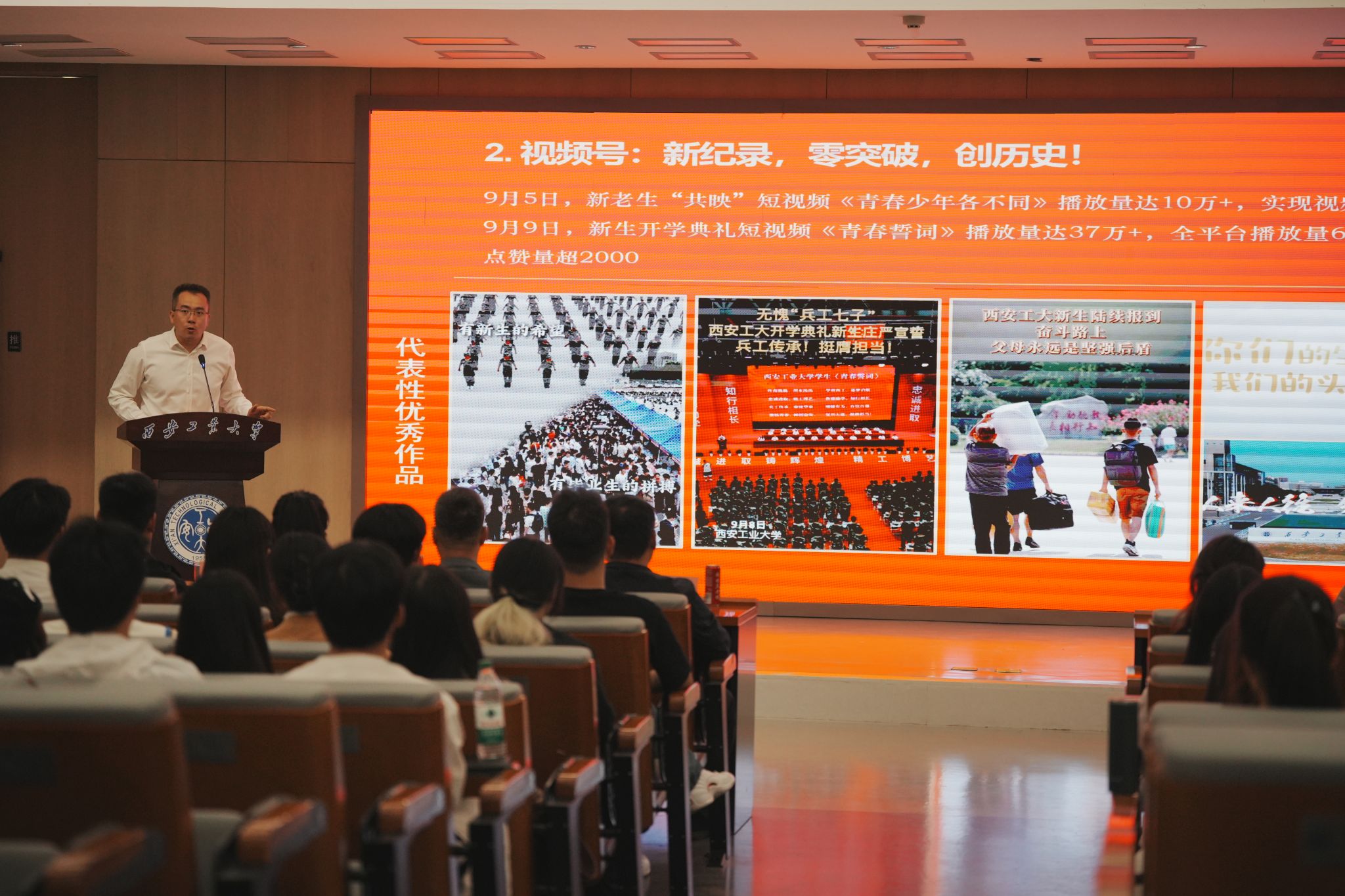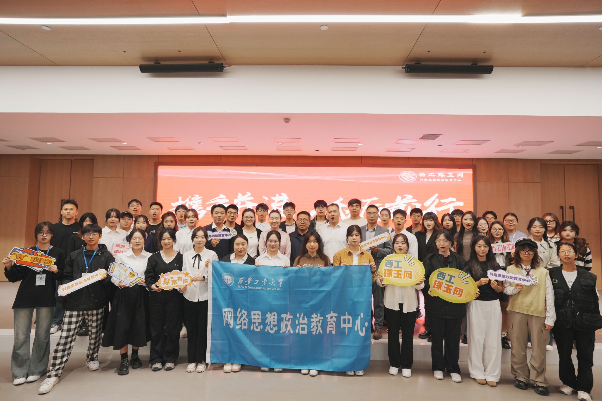 携手并进谋发展,砥砺前行向未来。10月9日,网络思政中心2023-2024学年总结表彰大会暨西安工业大学第三届网络文化节开幕式在未央校区图书馆报告厅顺利举行。学工部副部长、校网络思政中心主任张晓宾出席会议,网络思政教育办公室主任张鹏、团队指导老师许格宁、文学院学工办主任李聪、光电工程学院辅导员李俊洁、第3届全体学生骨干以及第4届全体学生骨干参会。