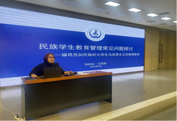 玛依拉·艾则孜作了题为《民族学生教育管理常见问题探讨——辅导员如何做好大学生马克思主义宗教观教育》的报告,她从开展大学生马克思主义宗教观教育的必要性、难点和高校辅导员如何做好马克思主义宗教观教育三方面阐述了在新时代背景下,加强大学生马克思主义宗教观教育的重要性和紧迫性。她谈到辅导员要深入了解大学生的思想动态和宗教信仰情况,有针对性地开展教育引导工作;要加强马克思主义宗教观的理论学习,提高自身的理论素养和教育能力;要创新教育方式方法,运用大学生喜闻乐见的形式和载体,增强教育的吸引力和感染力。