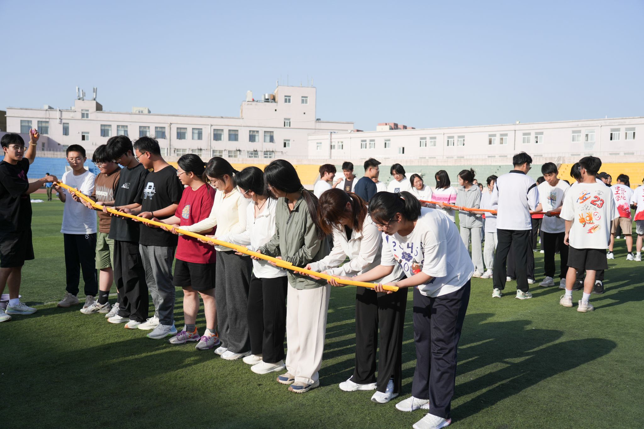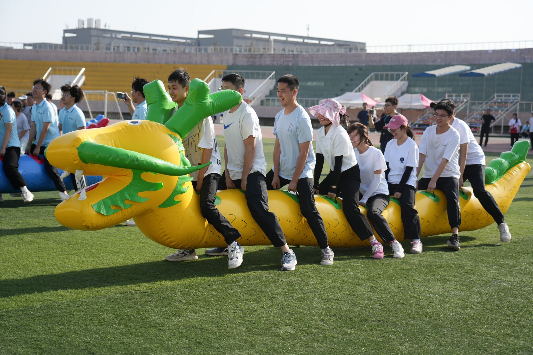 趣味运动会将娱乐与竞赛相结合,设置集体项目:“旱地龙舟”、“公鸡下蛋”、“珠行千里”和“旋风奔跑”;个人比赛项目:“逆风奔跑”、“趣味投壶”、“天旋地转”和“蒙眼踏步”,这些项目不仅考验同学们的智慧和协作,通过参与还达到了缓解压力和训练体能的目的,现场欢声笑语,氛围轻松愉悦。比赛中,赛手们奔跑、努力、受挫、调整、成功,啦啦队和观众们的加油声和掌声不断,田径场上充满了欢乐的气氛。