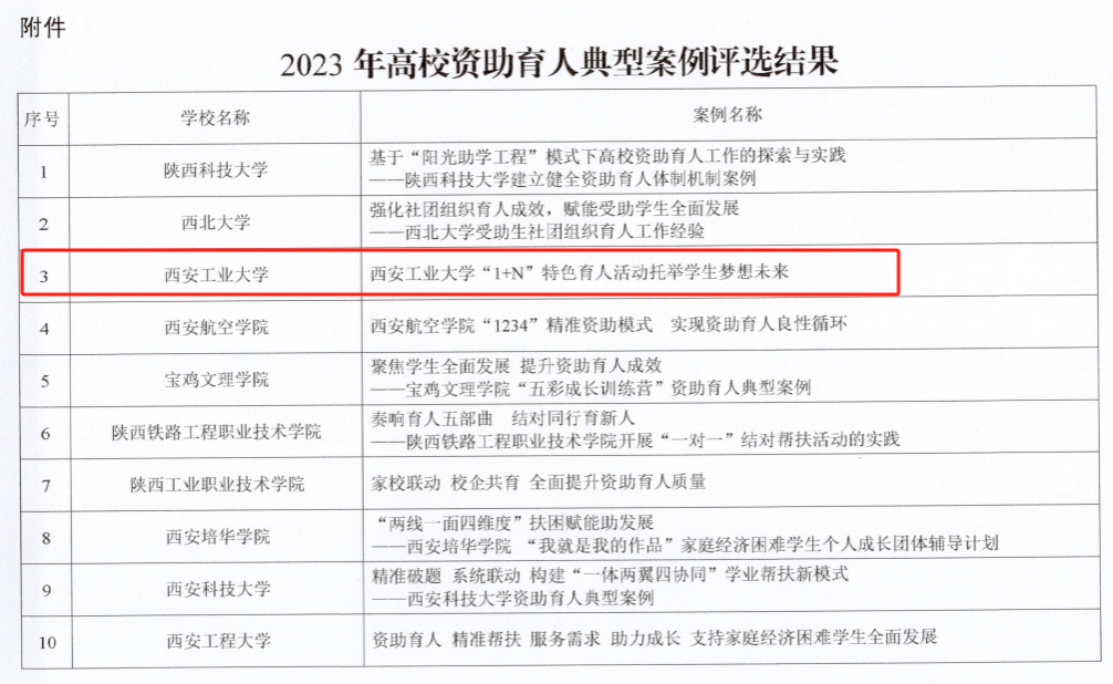 近日,在陕西省教育厅开展的高校资助育人典型案例评选中,我校报送的《西安工业大学“1+N”特色育人活动托举学生梦想未来》成功入选。该案例介绍了我校积极推进“发展型”资助,创新资助育人工作的特色做法和具体措施。