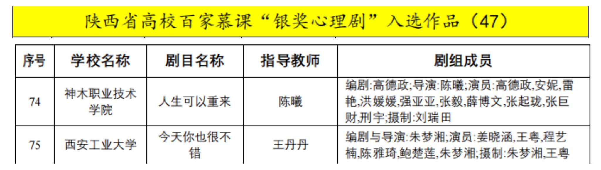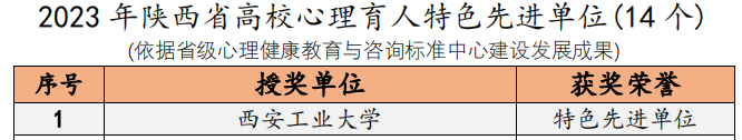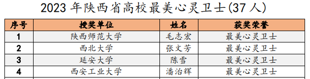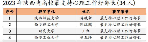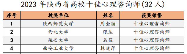 近日,陕西省高校心理素质教育研究会对2023年陕西高校心理育人相关工作进行表彰。我校荣获2023年陕西省高校心理育人“特色先进单位”称号。学校党委副书记马福获评“2023年陕西省高校心理育人最关心育德育心好领导”,学生工作部(处)长曹玉玲获评“最支持心理工作好部长”。学生心理发展指导中心教师潘治辉被评为“最美心灵卫士”,林晓萍被评为“十佳心理咨询师”,辅导员王梦馨被评为“百嘉育心辅导员”。在2023年陕西省高校星级注册心理咨询师执业年检中,林晓萍和左广霞获评“三星级心理咨询师”。我校师生自导自演的心理剧《今天你也很不错》(指导教师为文学院王丹丹),入选陕西省高校第八届百家慕课“银奖”心理剧。