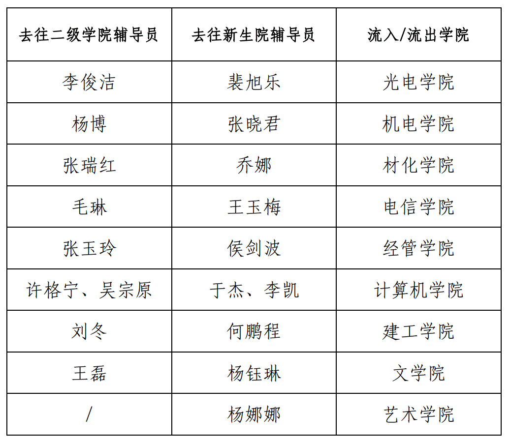 根据我校学生工作总体安排,结合各学院实际,现将部分辅导员岗位调整如下: