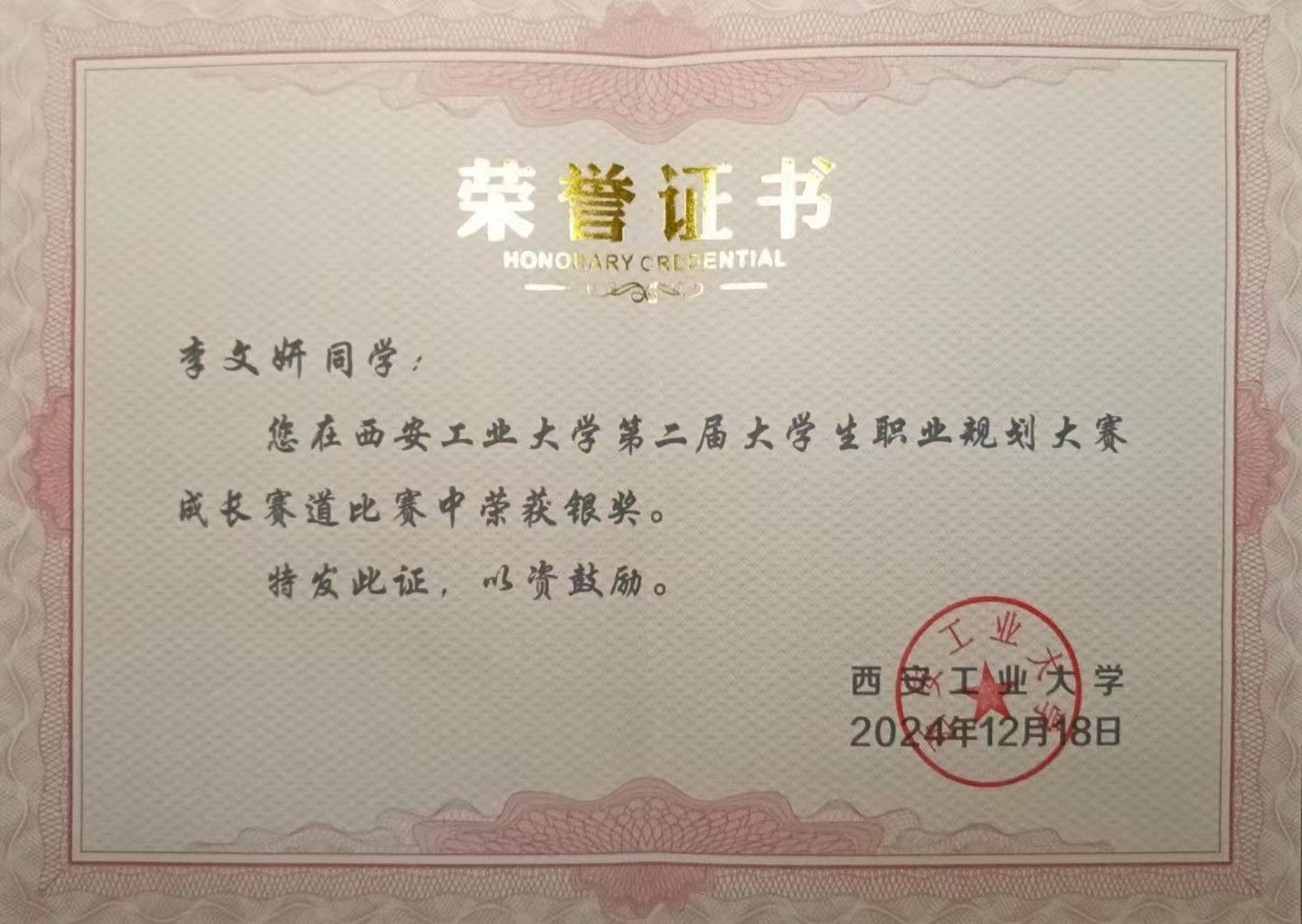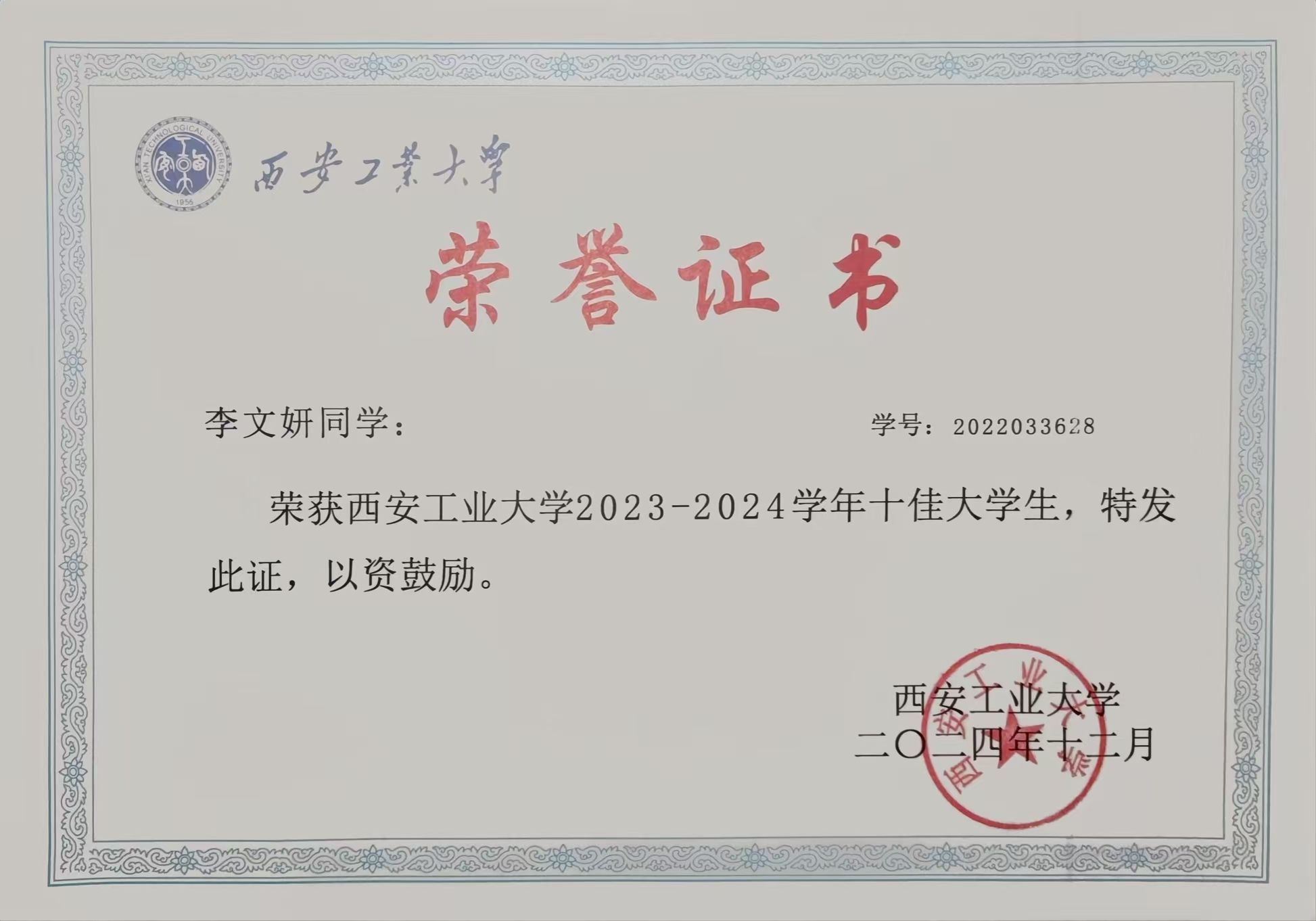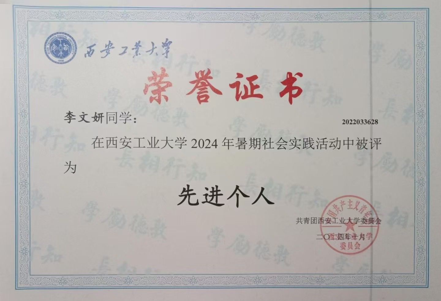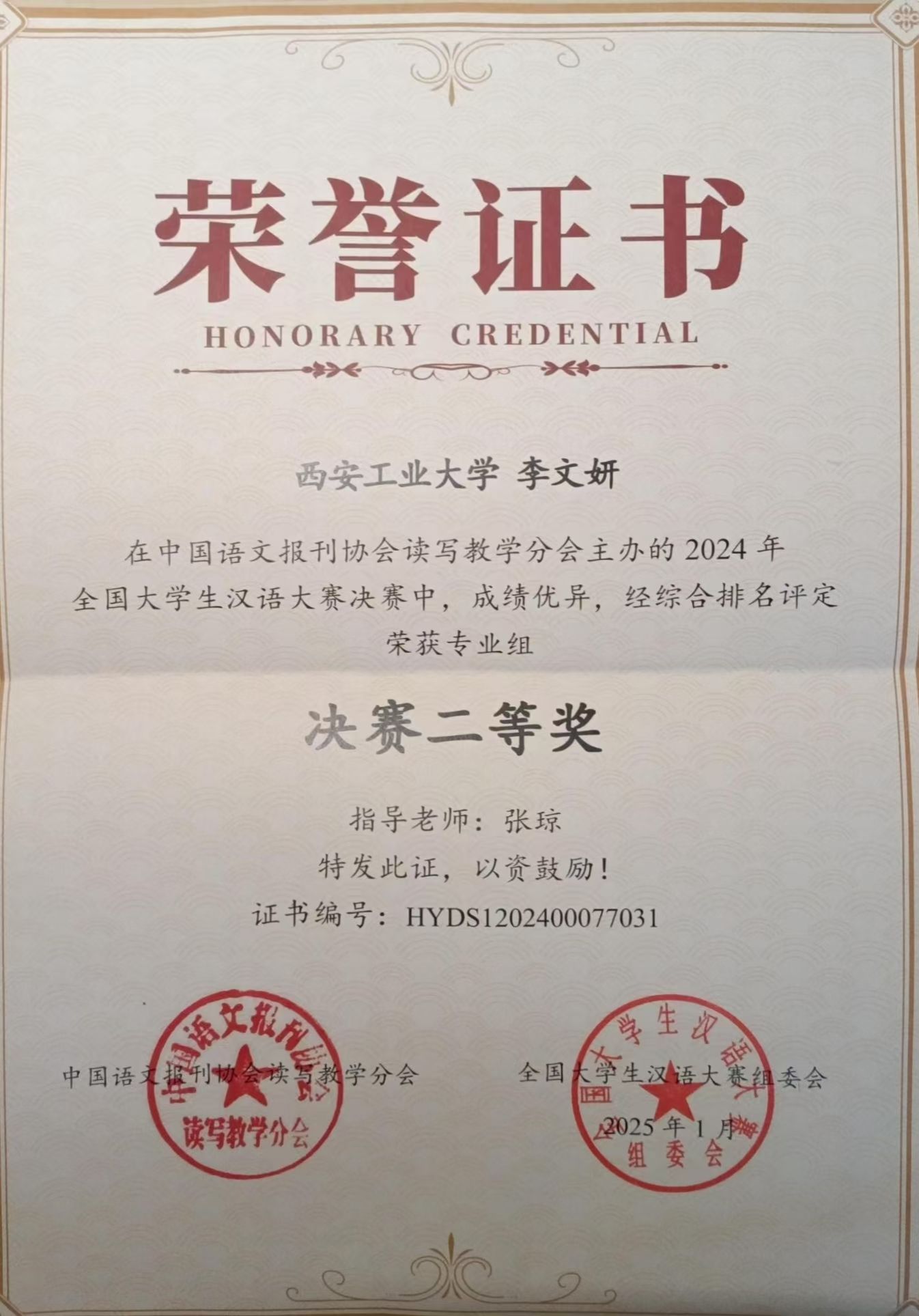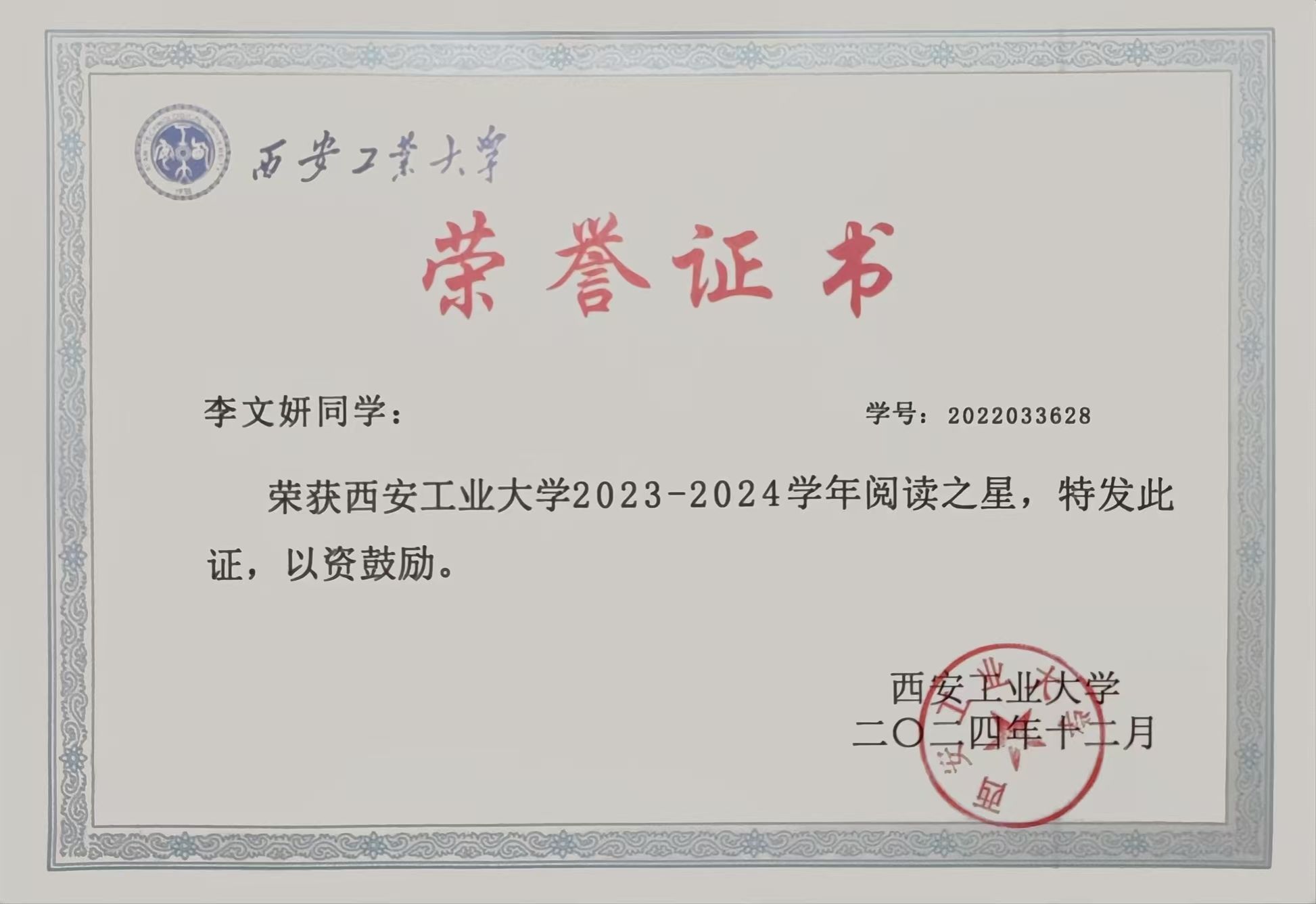 此外,她还作为校级阅读之星参与校图书馆好书推荐以及读书分享会;作为文字撰写者在校级、院级公众号上发表相关推文;同时还成为了西安市青年书法家协会的一员。李文妍利用课余时间参加各类校园文化活动,例如文学院“红楼一梦”校园文化节、“把一切献给党”红色朗诵、校运会等。她始终相信:点点星光汇聚,终成漫天繁星。