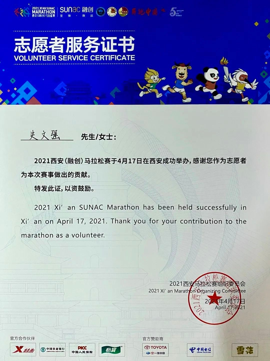 “西安马拉松志愿者服务证书”