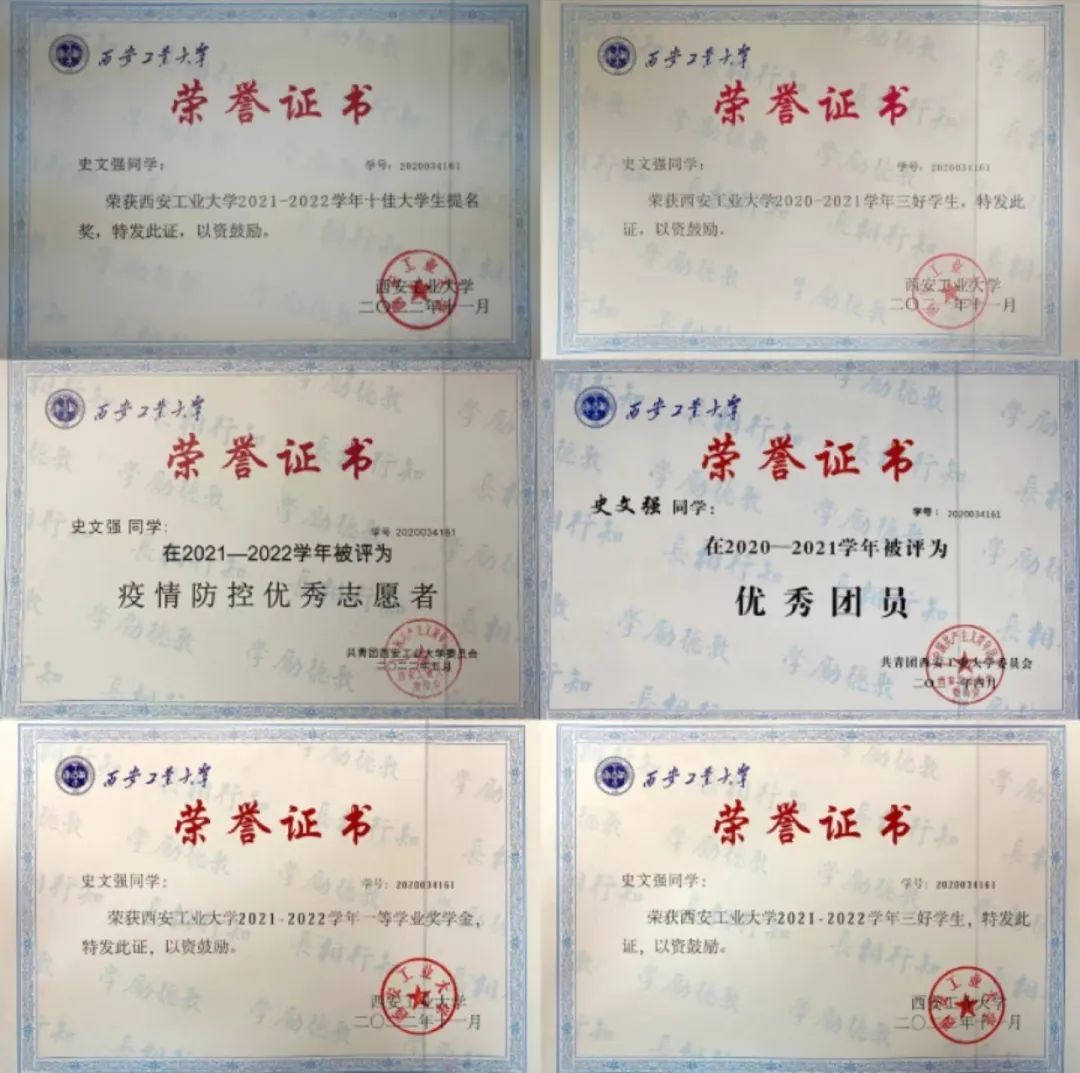 史文强也从不为自己设限,他勇于尝试,勇敢接纳更为广阔的人生。在创新创业类竞赛中,史文强获得一项国家级大学生创新创业训练计划项目,获得三项校级挑战杯全国大学生课外学术科技作品竞赛,提升了创新实践能力,专业知识的学习与竞赛的磨砺让他快速成长。