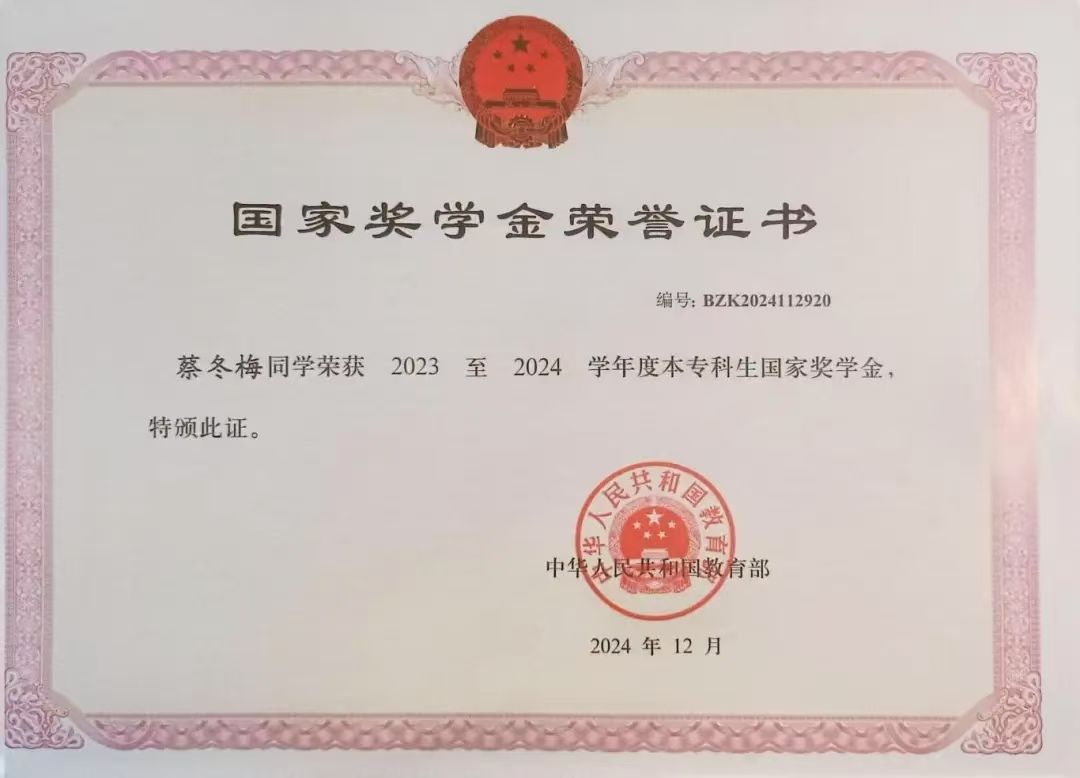 蔡冬梅认为作为一名大学生,最主要的任务就是学习,所以她从未放松过对学习的要求,在已结课的课程中,必修课有49门课程绩点在3.0以上;选修课有十余门绩点在3.5以上,连续三年专业排名均为第一。在校期间,她曾获国家奖学金,学校十佳大学生、三好学生、特等学业奖学金、一等学业奖学金等荣誉。