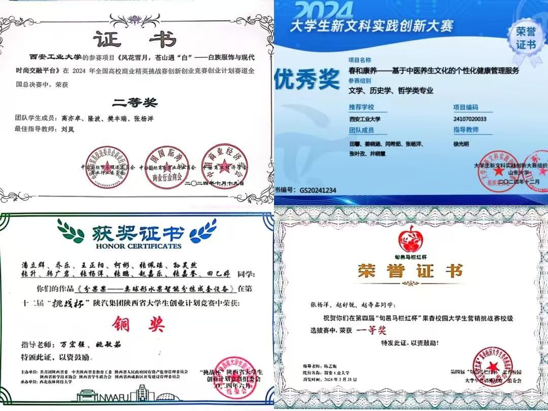 学科竞赛恰似淬炼真金的熔炉,是检验专业知识与实践能力的绝佳战场。张杨洋深知其中价值,踊跃投身各类学科竞赛,以赛为梯攀登知识高峰,将赛场视作成长的沃土。在2024年各类竞赛的舞台上,她凭借扎实的专业功底与不懈努力,收获了累累硕果:全国高校商业精英挑战赛全国二等奖、大学生新文科实践创新大赛全国总决赛优秀奖、第十一届“学创杯”全国大学生创业综合模拟大赛省级二等奖、第十四届“挑战杯”大学生创业计划竞赛省级铜奖…… 每一项荣誉背后,都是她勇毅前行的足迹。